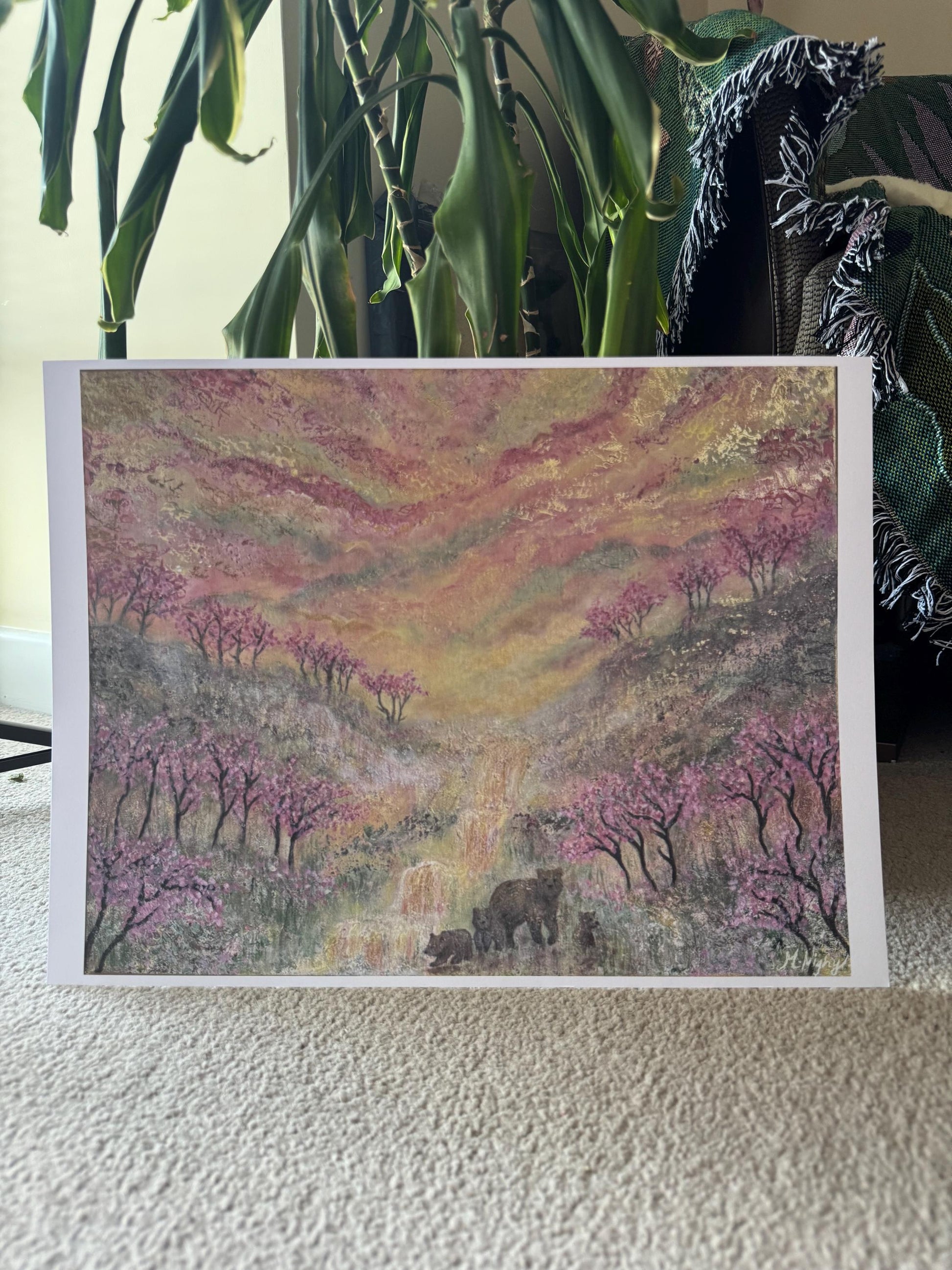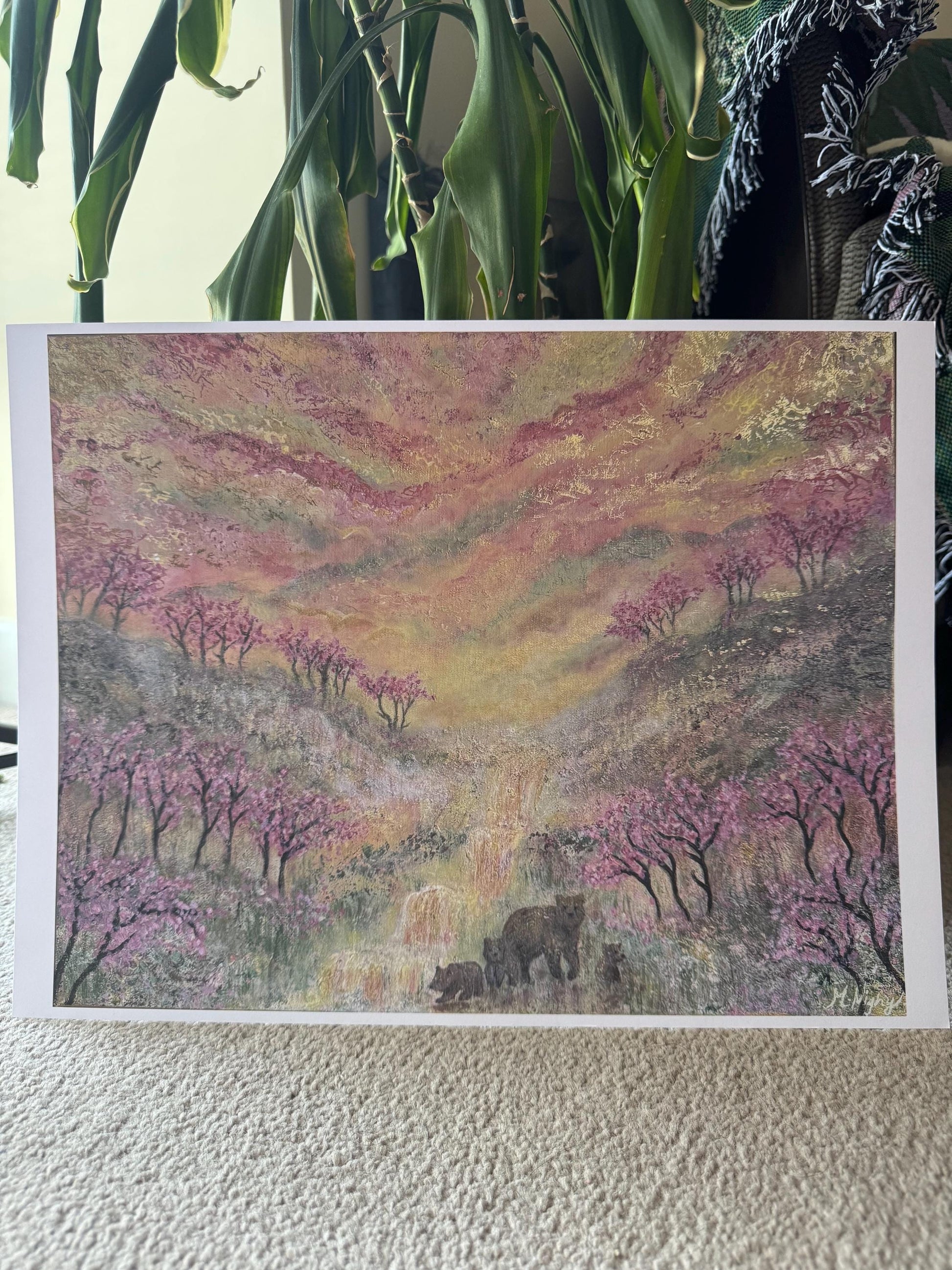 A symbolic painting with the blossom trees and bear cubs blooming and growing together. The art shines in the light as there is gold paint highlighting throughout.