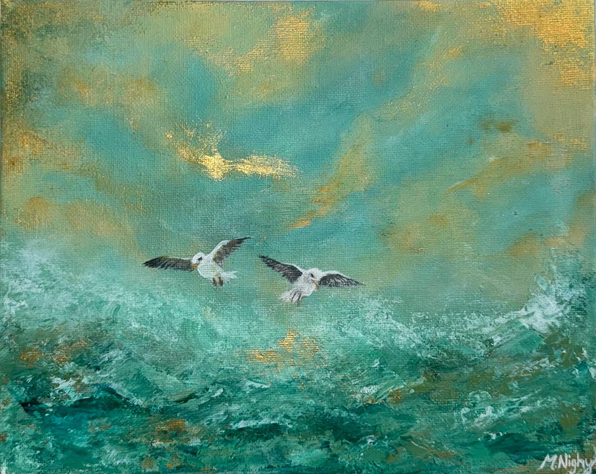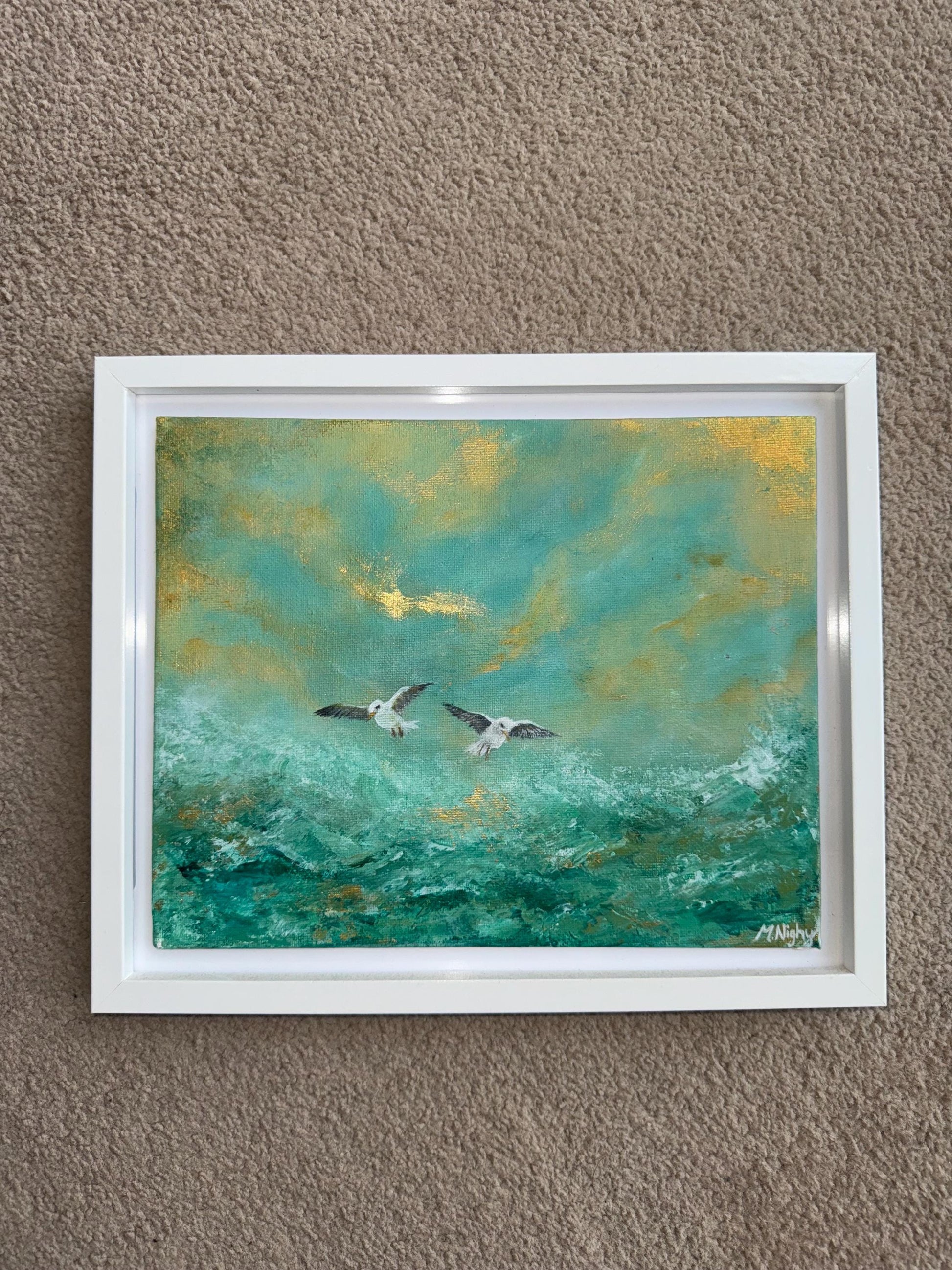 Flight before the storm is an abstract ocean painting lightly inspired by pirates of the Caribbean! The primary colour of the Art is an Emerald shade. The gold paint catches the light beautifully.