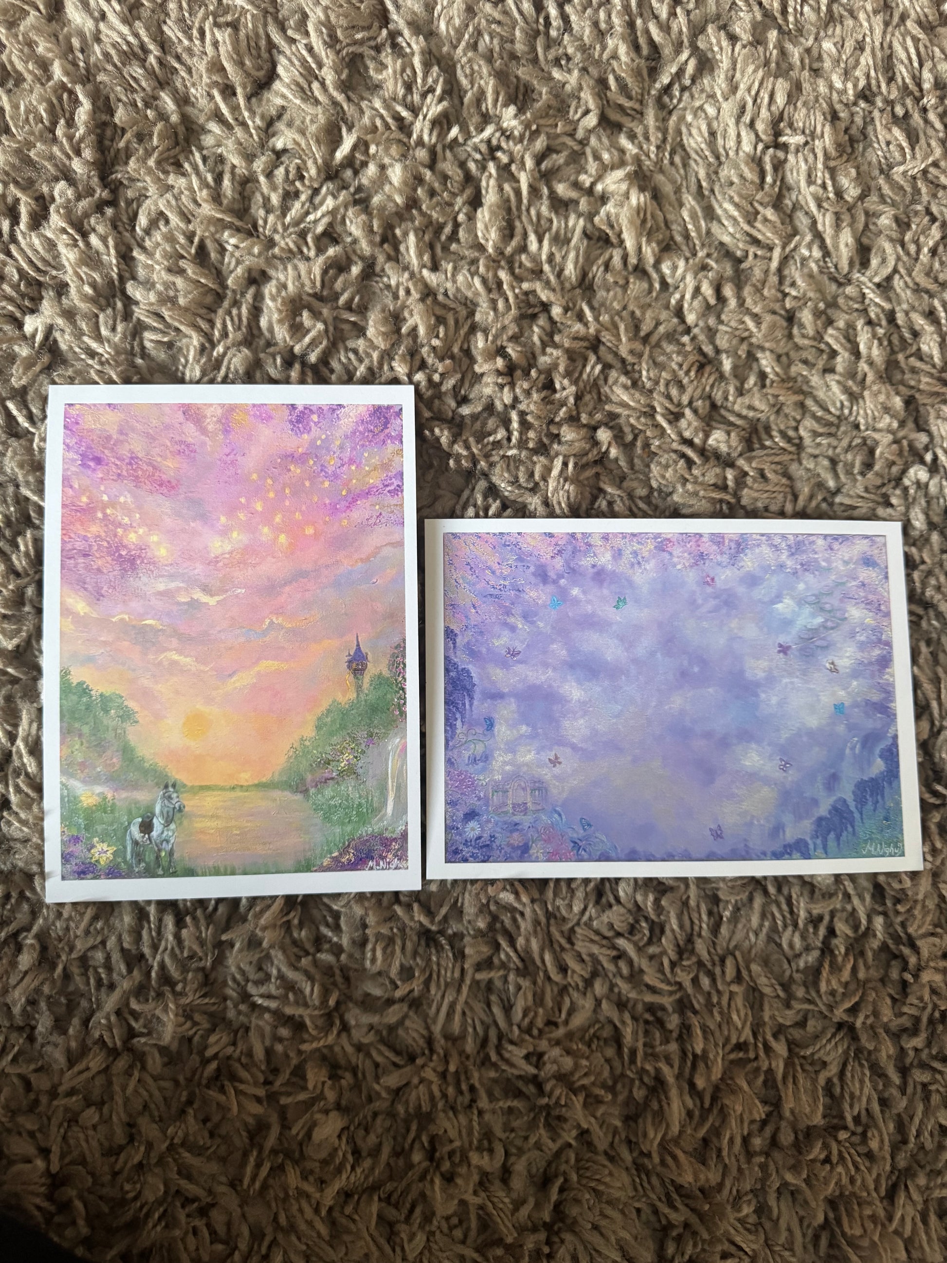 Postcard sized prints! The available designs are my dreamscape, lovers flight , my tangled theme one A Dream in The Lantern Light, and my Barbie inspired one Waltz of the butterflies :)
