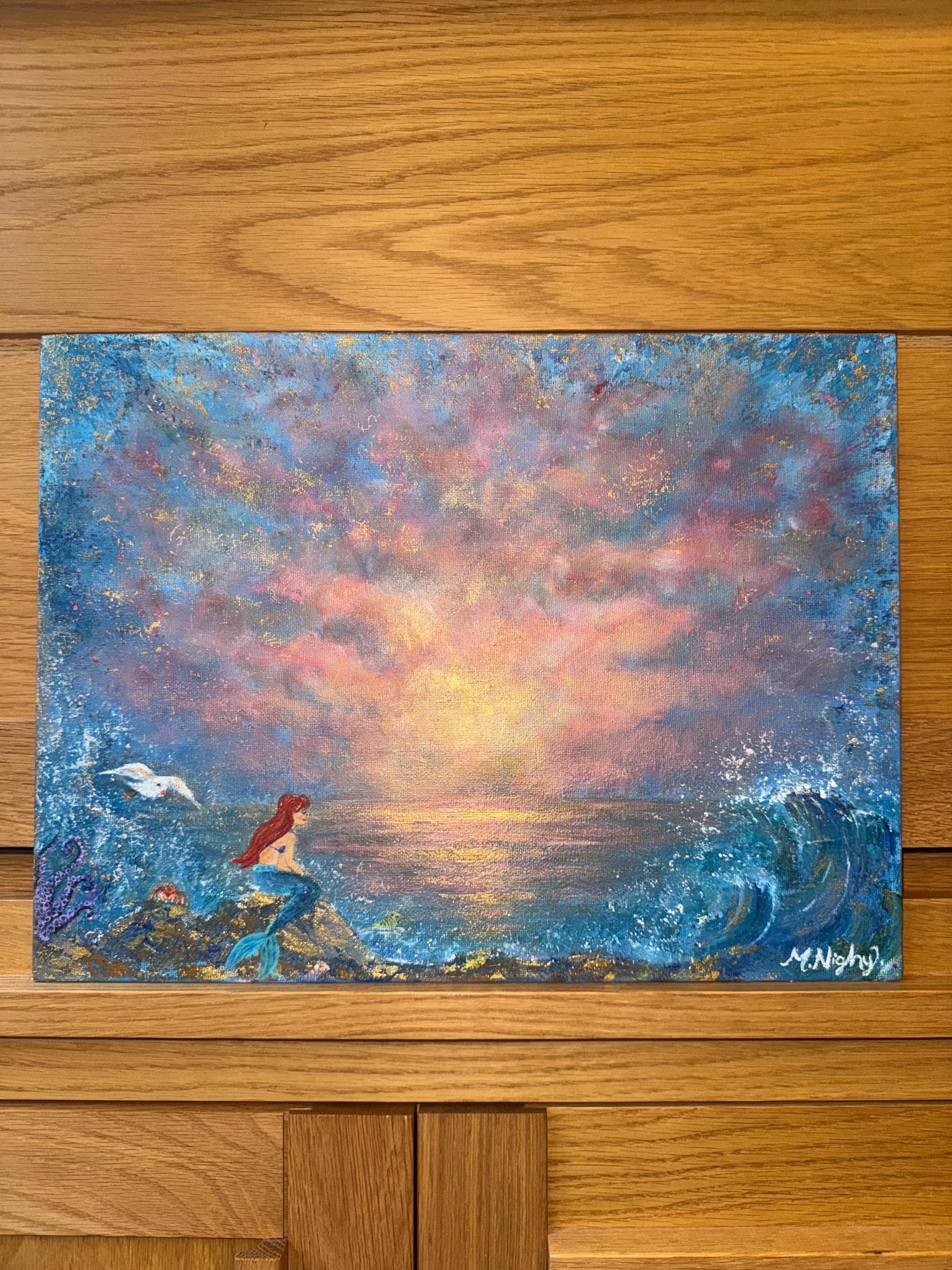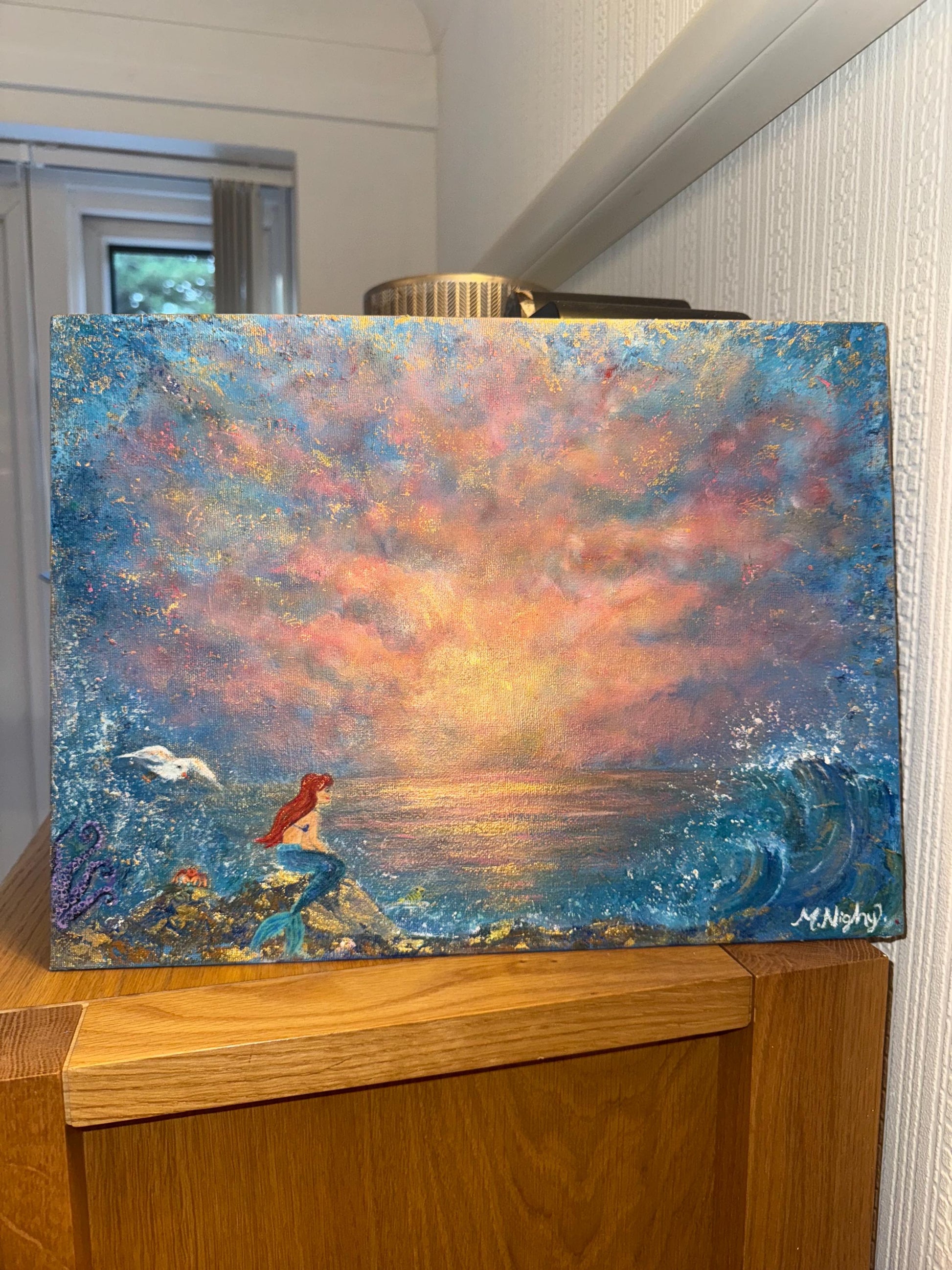 My newest painting inspired by the little mermaid. Including all the iconic characters throughout the painting, you can spot Ariel, Sebastian, scuttle, flounder and Ursula. The gold paint glistens in the light and it is on flat board canvas so can be framed!