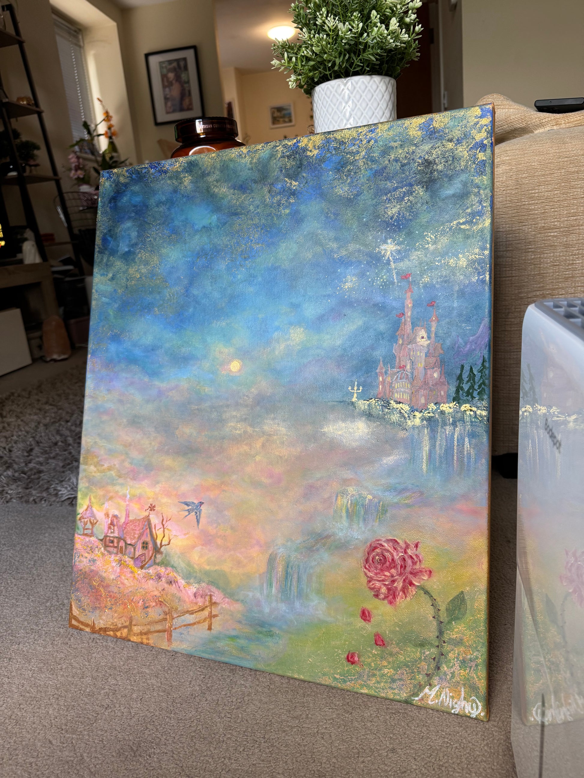 My painting ‘Tale as Old as Time’ is inspired by Beauty and the Beast and is the 6th piece in my Disney collection. It features Belles cottage from the original movies, the beasts castle, the iconic rose and some smaller features including the swallow bird that flies around Belle by her cottage and lumiere stood by the castle! There is no extra shipping fees when purchasing a large painting!