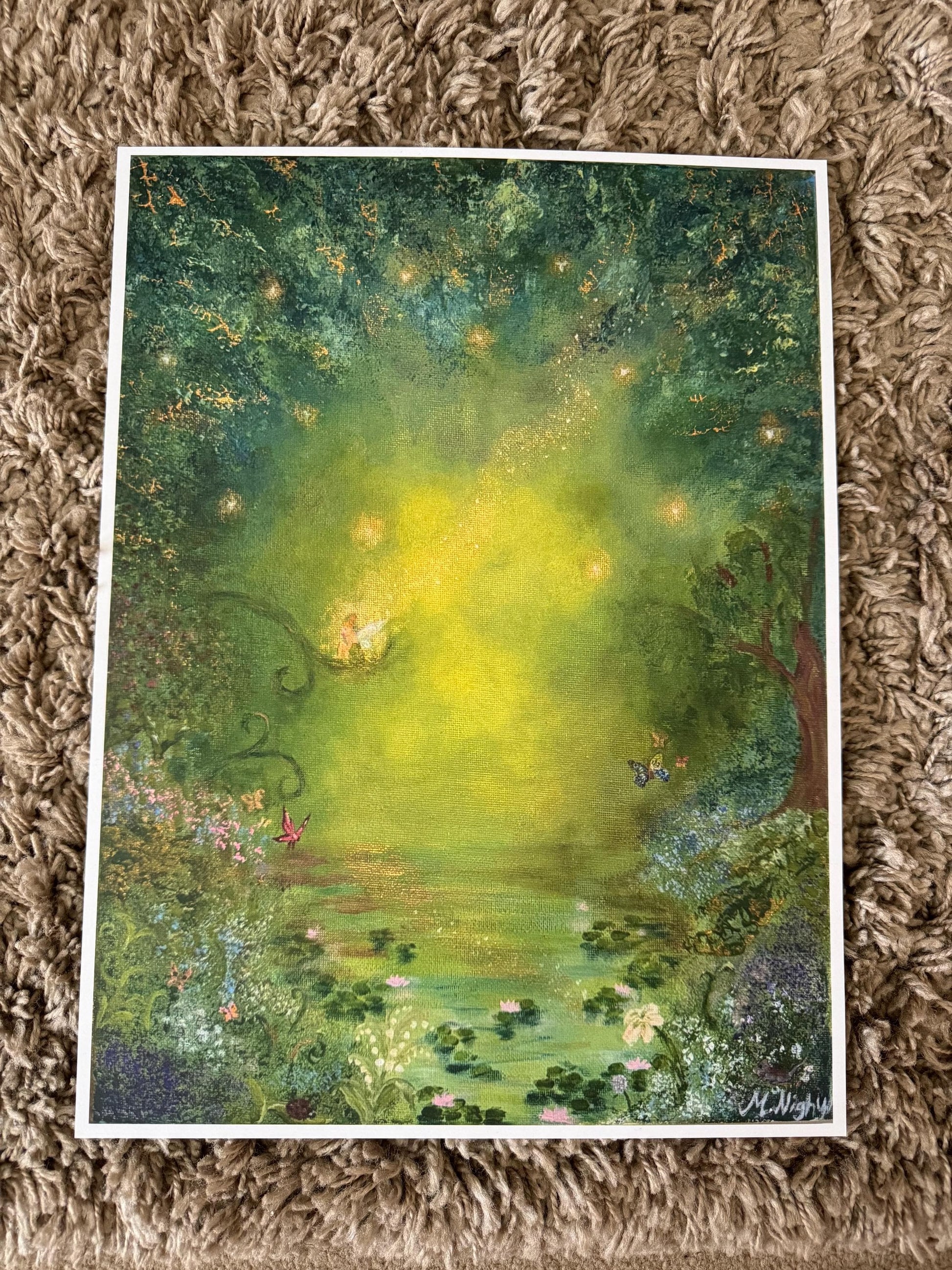 Prints of the glow of pixie hollow! The print is ordered exactly as the first photo of the painting is. I’ve attached 2 photos of the prints as well, one is in a frame! In this Tinkerbell inspired painting there is lots of Easter eggs and nods to the movies. There is cheese the mouse, the a lady bird, the half painted butterfly from the great fairy rescue and tinkerbell leaving a trail of pixie dust!