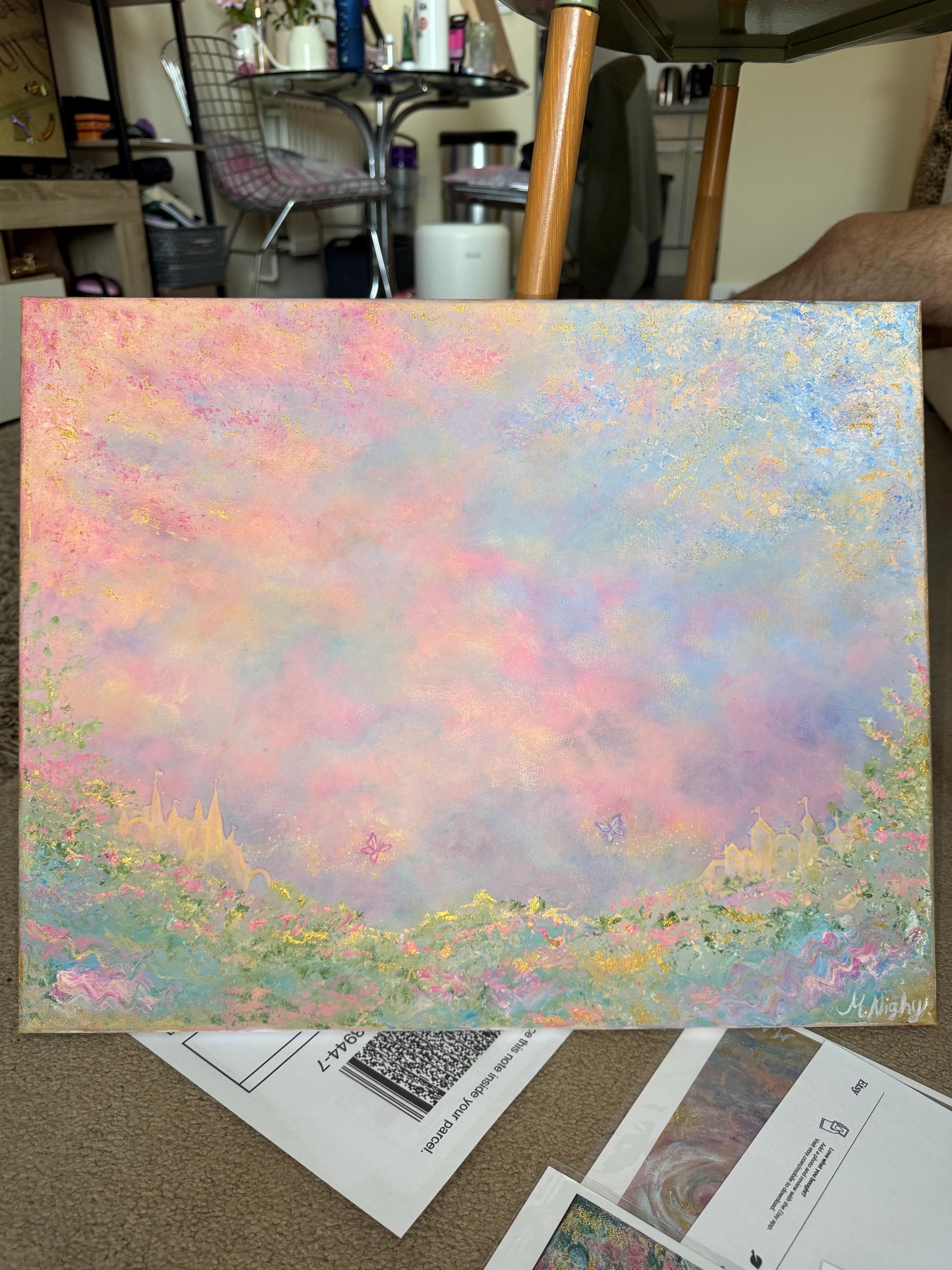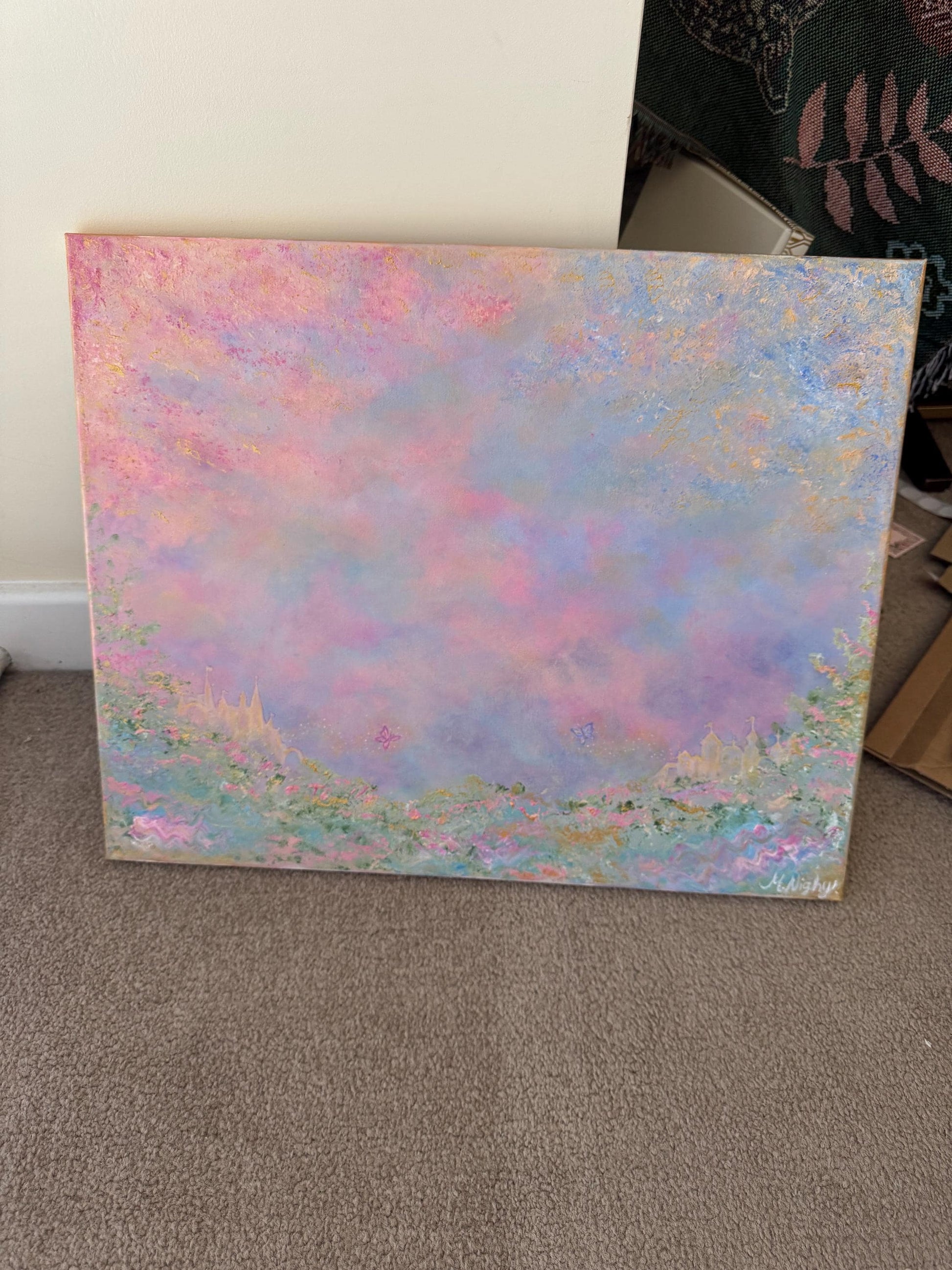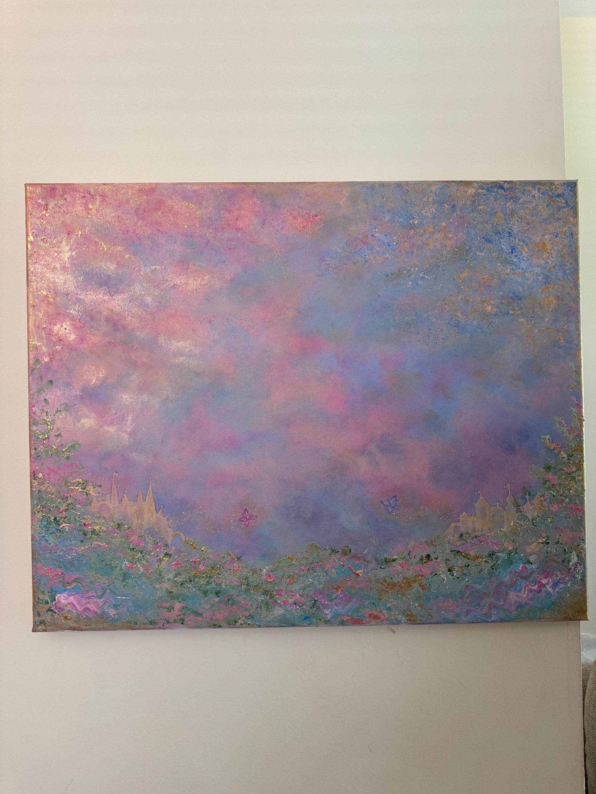 My newest 16x20inch painting inspired by Barbie - The Princess and the Pauper! It features a pink side and a blue side blending together with the butterflies meeting in the middle. Annalise's castle is on the left and Erica’s village is on the right. The gold paint shimmers in the light to give that magical Barbie feel :) The colours may appear different depending on the lighting, so I’ve attached lots of pictures in different spaces! The painting arrives signed and varnished for protection and longevity. I hope this brings some magic to your home 💝