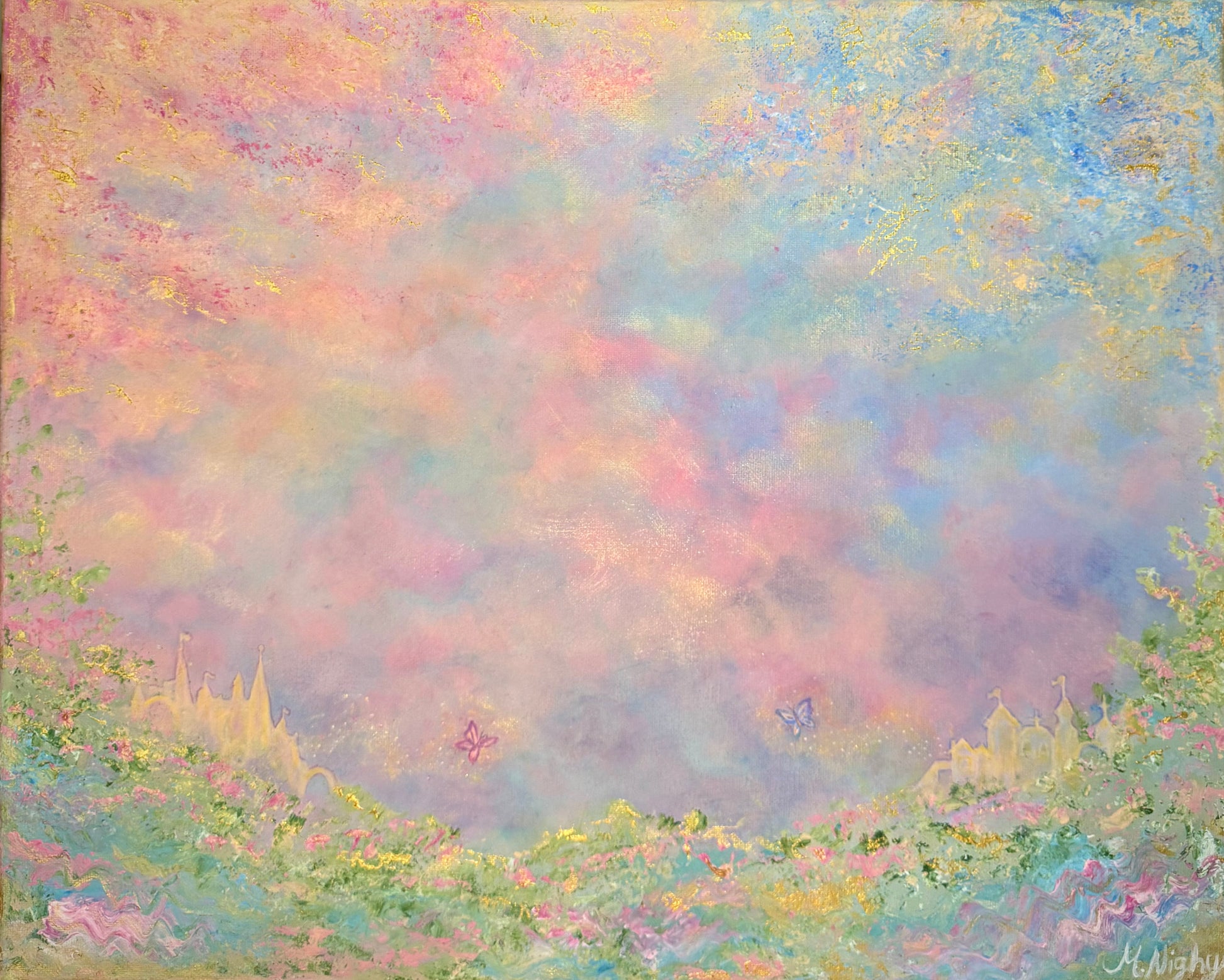 My newest painting inspired by Barbie - The Princess and the Pauper! It features a pink side and a blue side blending together with the butterflies meeting in the middle. Annalises castle is on the left and Erica’s village is on the right. The gold paint shimmering in the light is captured on the print to give that magical Barbie feel :). I hope this brings some magic to your home 💝